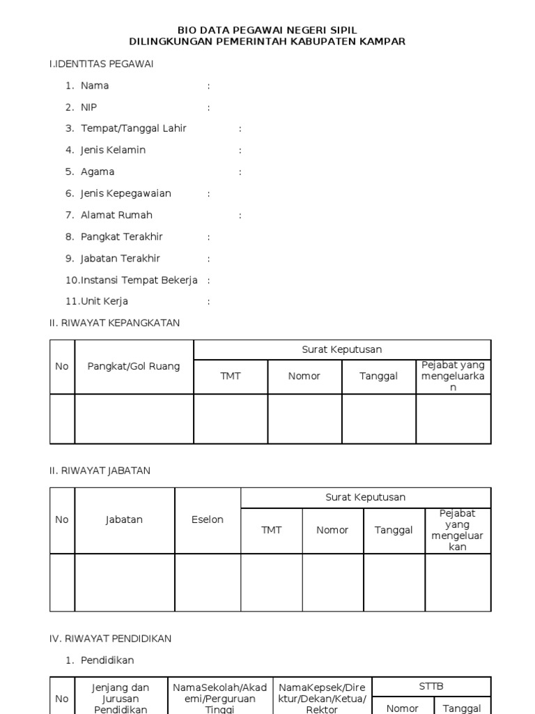 BIO DATA PEGAWAI NEGERI SIPIL DILINGKUNGAN PEMERINTAH KABUPATEN KAMPAR IIDENTITAS PEGAWAI 1. Jika format data sudah dibuat dan sudah di sisi rumus kemudian ada penambahan data maka insert sebelum baris terakhir. Contoh Uraian Tugas untuk penyesuaian ijazahpeningkatan pendidikan Contoh Riwayat Pangkat dan Jabatan untuk jabatan struktural dan jabatan fungsional.