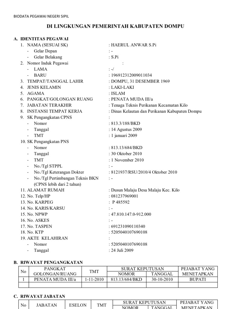 Dalam hal ini bila sudah PNS silahkan mencantumkan NIP Anda. If you are searching for a biodata sample you can download the biodata forms in pdf format at Formsbirds. Unduh sebagai DOC PDF TXT atau baca online dari Scribd.