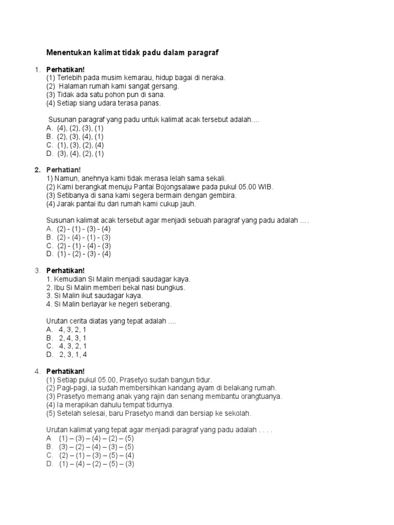 Soal Menentukan Kalimat Tidak Padu Dalam Paragraf