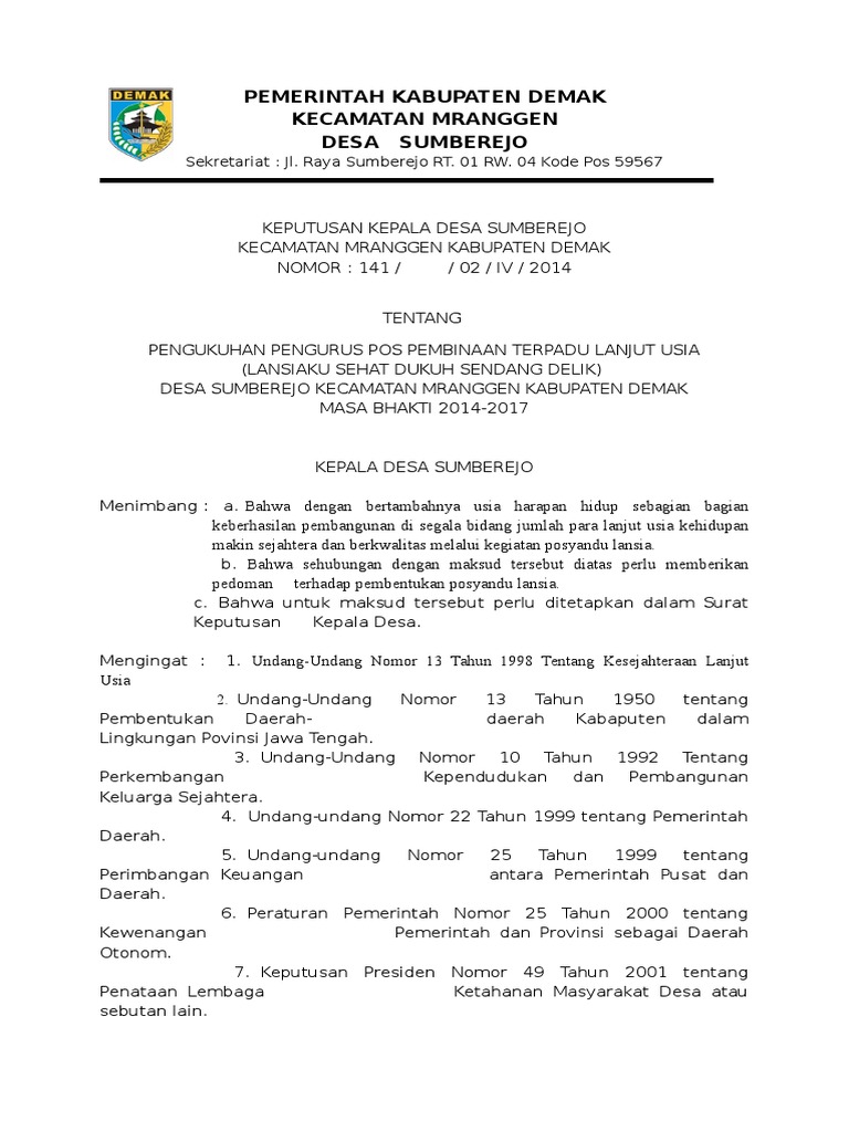 Contoh SK Kades Penunjukan Kader Posyandu Lansia Desa Tahun 2020 Ditulis pada. Pemerintah kabupaten lampung tengah kecamatan padangratu kampung margorejo keputusan kepala desa margorejo nomor. 0336 881013 SURAT KEPUTUSAN KEPALA DESA TEGALSARI Nomor.
